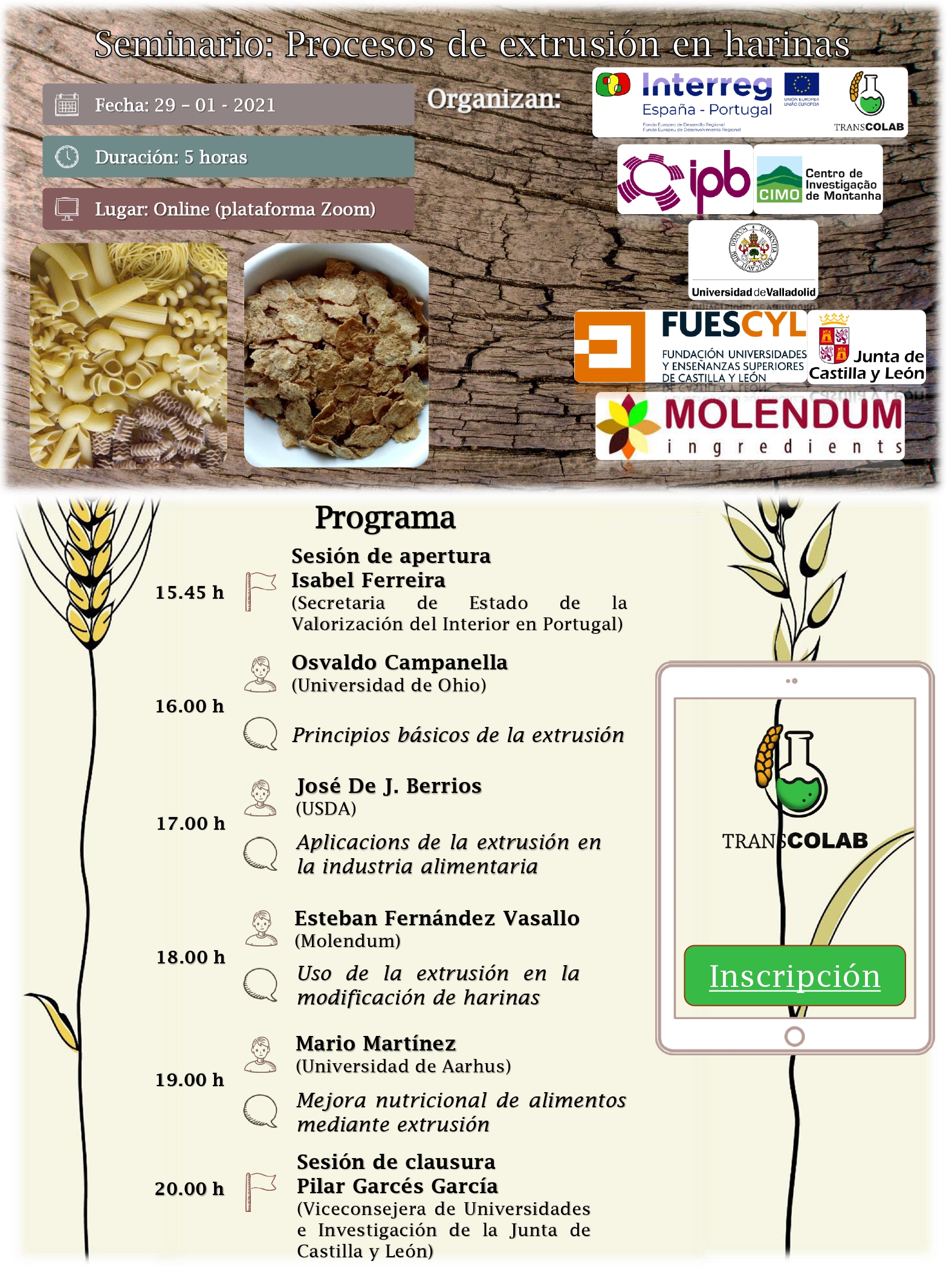 Tenemos el placer de invitarles al "Seminario: Procesos de extrusión en harinas" que se engloba dentro del marco del proyecto Interreg TRANSCoLAB: Laboratorio Colaborativo Transfronterizo para la sostenibilidad e innovación del sector agroalimentario y agroindustrial, liderado por el Instituto Politécnico de Bragança y que incluye diferentes universidades, instituciones y empresas de las regiones de Castilla y León y Norte de Portugal.
